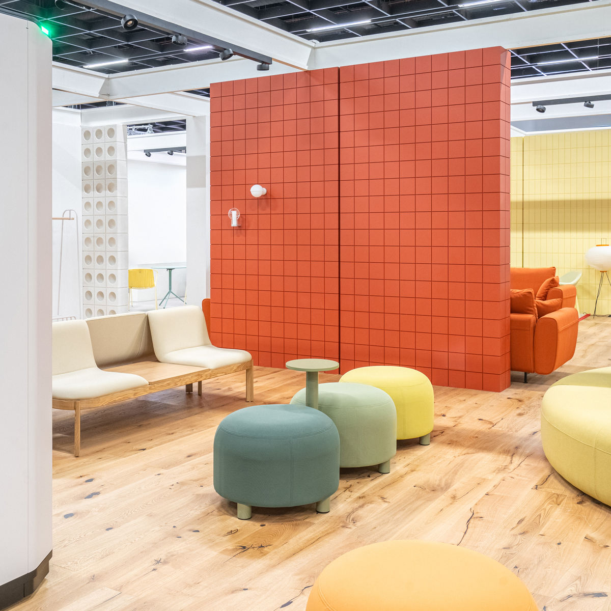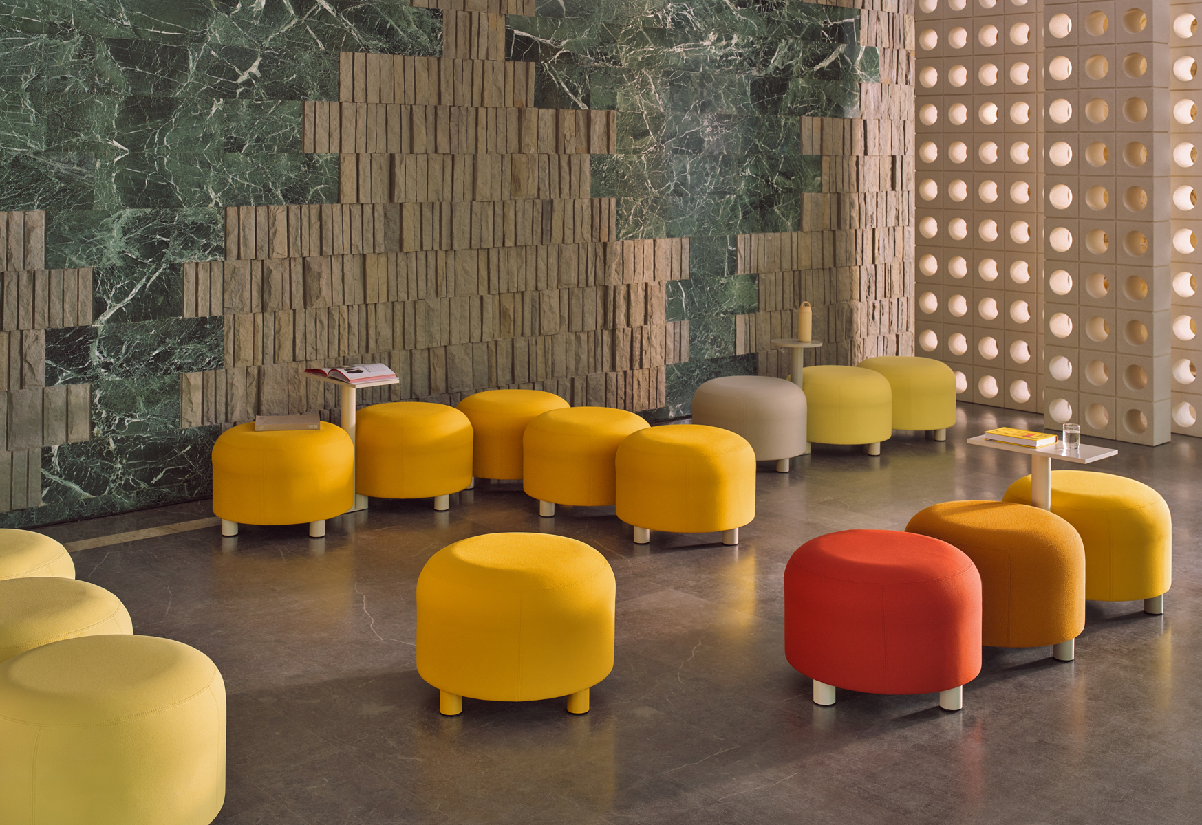 Inspiracją dla modułowego systemu Dots była gra „Connect Four” („Cztery w rzędzie”). Wybierając spośród gotowych konfiguracji, lub zestawiając pufy w swój układ, użytkownik z łatwością dopasuje siedzisko do swoich potrzeb i do charakteru przestrzeni. Funkcjonalność całości poszerzają opcjonalne stoliczki mocowane na łączeniach puf. Wykonane z płyty wiórowej i pianki, moduły są wygodne i trwałe. Modułowy charakter sprawia, że Dots sprawdzi się doskonale w przestrzeniach wspólnych i otwartych, szczególnie w biurach i centrach handlowych.
